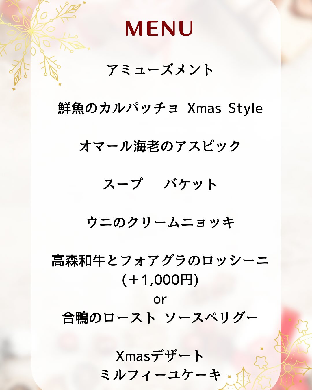 ※コース内容は仕入れの関係で変更になる場合がございます。アレルギーがある方は事前に必ずお申し付けください!